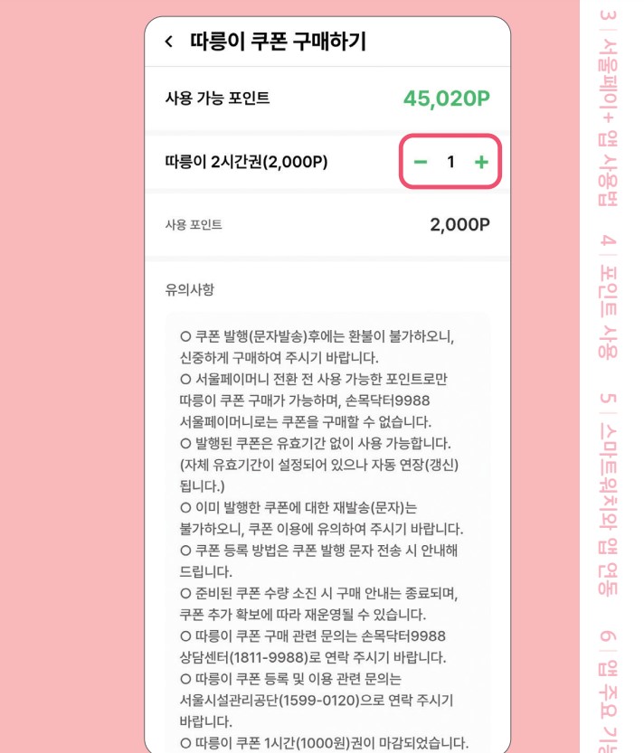 [ - ] 또는 [ + ]를 선택해 따릉이 쿠폰 매수를 선택해 주세요.