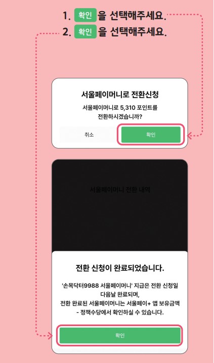 모은 10만 포인트는 '손목닥터9988 서울페이머니'로 전환하여 병원, 약국, 편의점 등 서울 페이머니 가맹점에서 현금처럼 사용이 가능합니다.