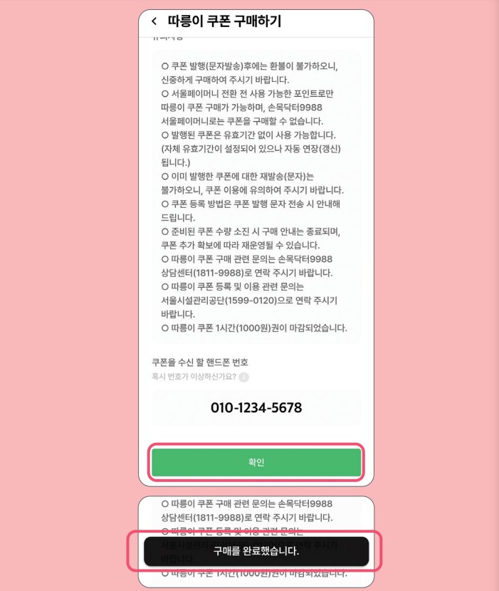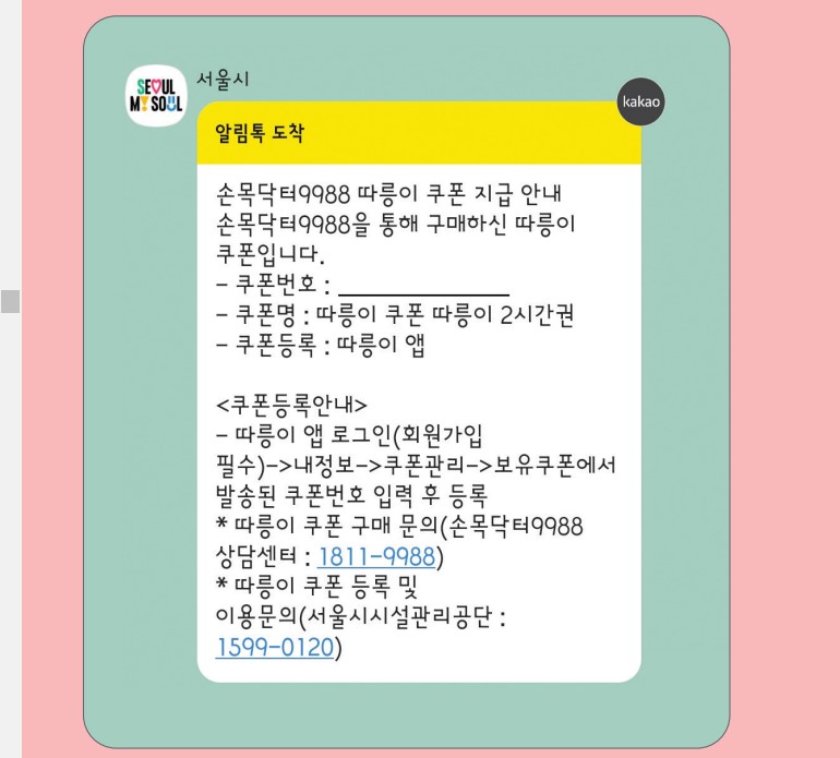 따릉이 쿠폰을 구매하시면 카카오톡 알림톡이 발송됩니다.