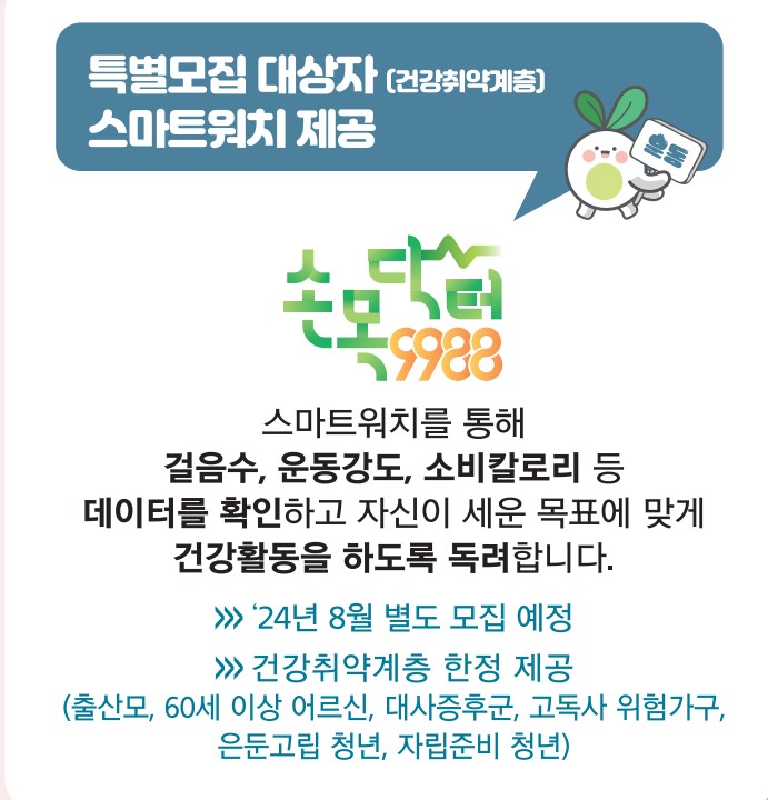 기본적으로는 별도 워치 없이도 모든 서비스가 가능하지만 건강취약계층 한정으로 스마트워치를 제공합니다.(출산모, 60세 이상 어르신, 대사증후군, 고독사 위험가구, 은둔고립 청년, 자립준비 청년)